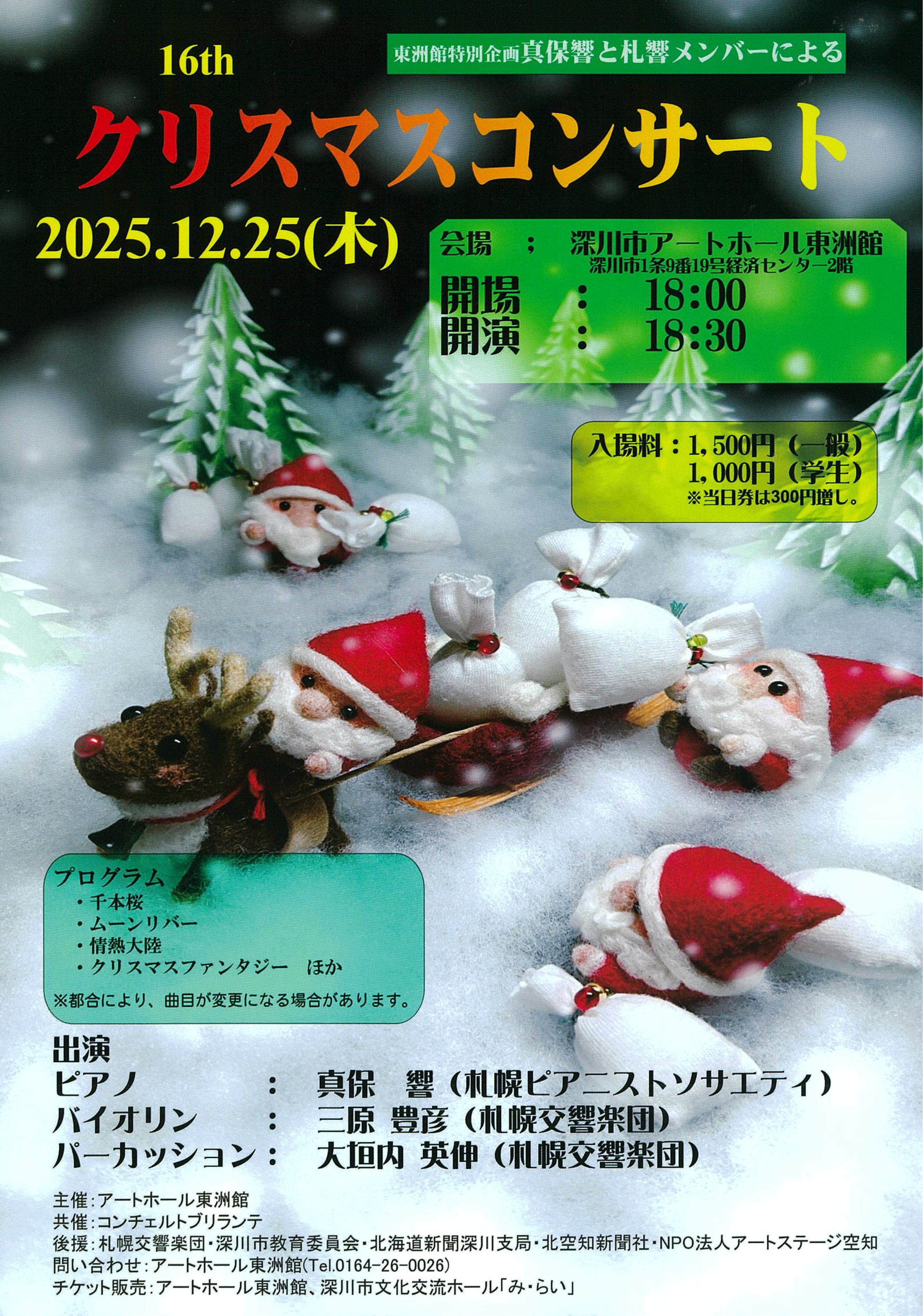 道内を中心に活躍する市内在住のプロピアニスト真保響さんと札幌交響楽団メンバーによるクリスマスコンサートを開催します。真保響さんと札幌交響楽団メンバーが奏でる美しいハーモニーをぜひお楽しみください。