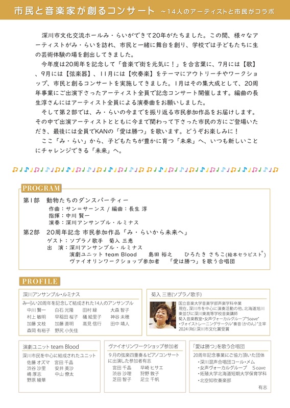 深川市文化交流ホール「み・らい」は、皆さまの温かいご支援とご協力のもと、開館20周年を迎えたことを記念し、皆さまへの感謝の気持ちを込めて「音楽で街を元気に!」を合言葉に記念事業を開催いたします。